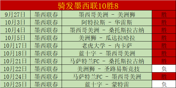 墨西联10胜8,美洲赛事发挥一直出色。15天胜10天胜+11,狂飙胜+值得认可!