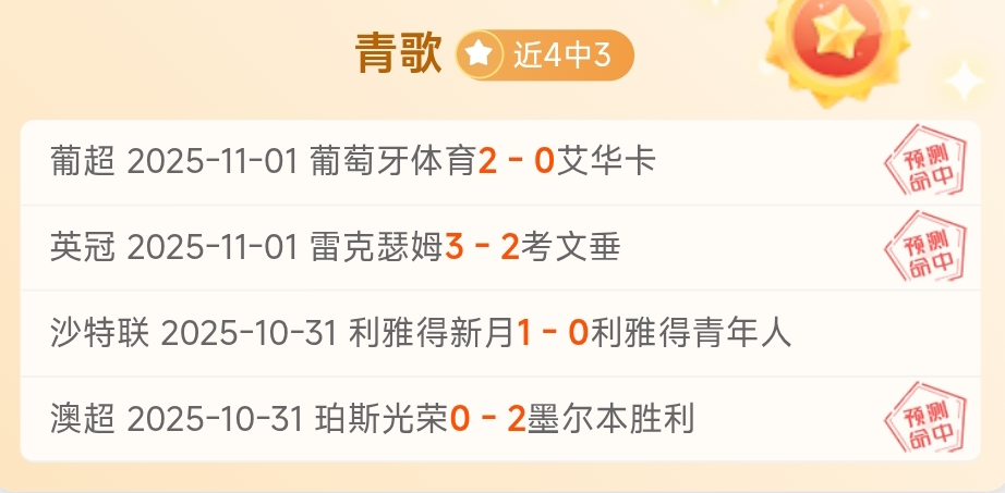 青歌简报:昨澳超2中1,沙特红卡最终卡数据,后续晚场的拿手英冠顺利打出以及每日一场的重点赛事葡超亦打出,整体尚可,周末来临,继续奉献高质量赛事。
