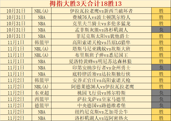 NBLA昨胜现在14胜11。整体成绩大胜3天合计18胜13!