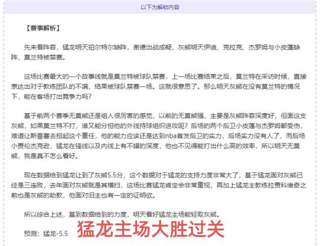 以下为解锁内容:含赛事解析+数据分析+观点参考
