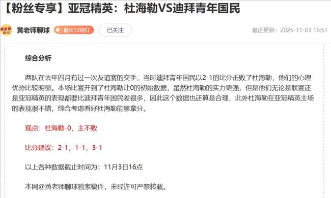 赛事回顾:昨日亚冠精英拿下杜海勒!印尼超也命中马鲁特联比分,目前结束的3场命中两场,今日我们继续精挑细选,以稳为主,期待能够有一个好的收获!