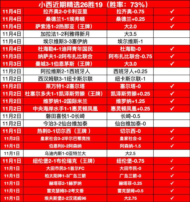 战绩回顾:昨日表现不俗,是取得了5胜2负1走的出色战绩,近26胜19,胜.率是达到了73%!实力可见,今日小西擅长的欧冠比赛,加油!冲!