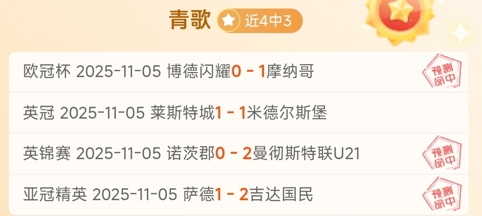 青歌简报:昨日整体8中5尚可,比较遗憾的是英冠多打一人反而被绝平错失后期四连红,不过重点赛事顺利拿下,今日继续奉献高质量比赛回馈粉丝支持。