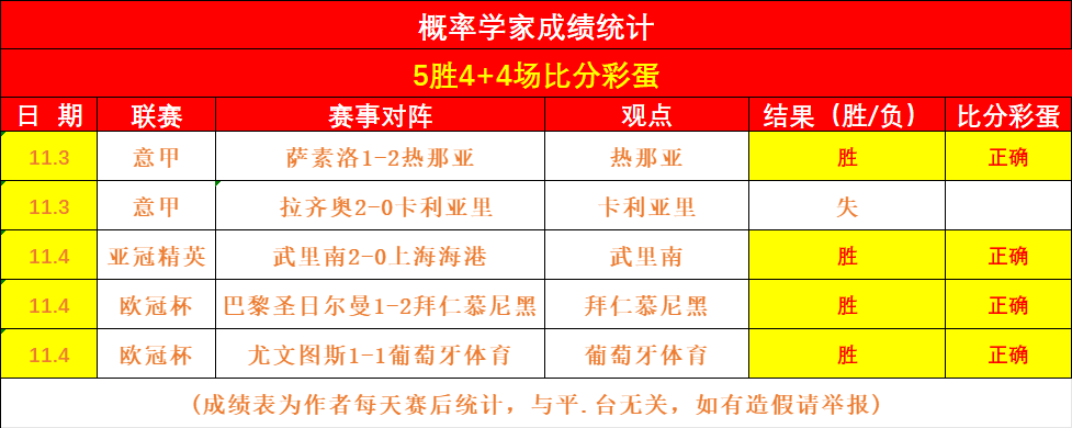 战绩回顾:昨天3场杯赛,方向及比分全部正确;5胜4+4场比分,状态相当理想。大家可以点点关注,建议不要单单挑选某一场比赛,某一篇文章,要留意概率送出的每一场比赛,这样就可以更好地与概率同步,可以长期取得正向的收获。