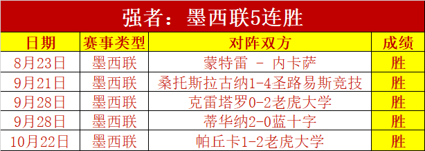 墨西联5连胜,精彩美洲赛事再次来临。11月保持正向胜+,十月月成绩胜+16,月成绩保持强势