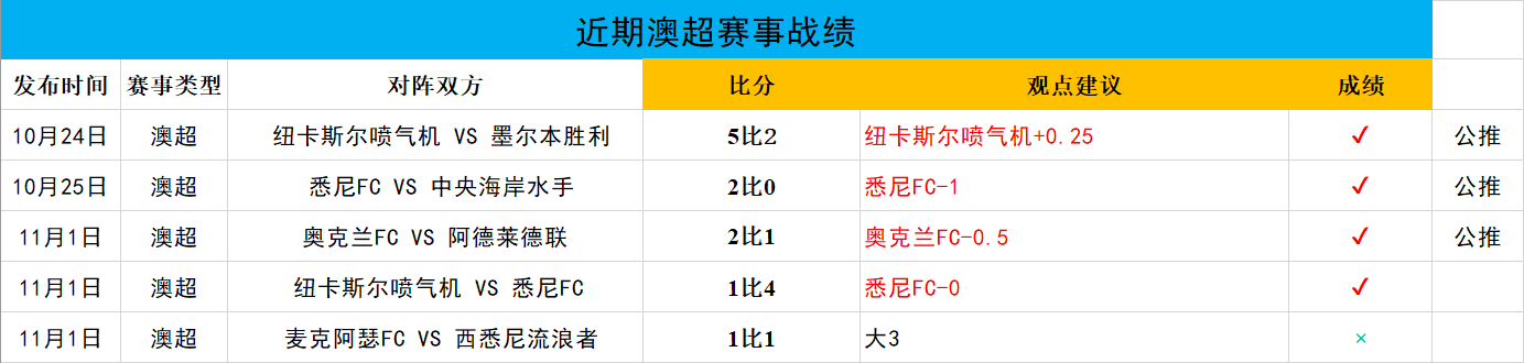 昨日三场亚冠2命中两场方向,未命中的一场只命中了国安穿的方向,进球数没有命中,目前战绩9中7,以下是不知统计的本周战绩图和澳超战绩图,继续给大家澳超的分析,在此祝大家场场红!