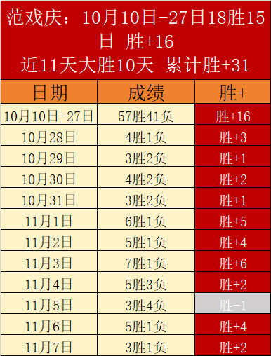 昨天4胜3,近11天大胜10天胜+31,胜+表现尤其突出,10月10日-27日18天胜15天胜+16,胜+表现尤其突出。