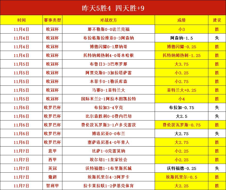 昨天5胜4打出,四天胜+9!今天赛事依旧选择强项系列,持续稳,别错过了!笔者近期前进脚步表现仍然优秀,本日赛程继续出击,争取在稳健的基础上进一步突破!