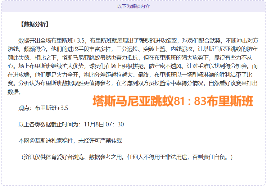 【成绩回顾】昨胜利再打响,NBL重量级赛事午场获胜,精选比赛拆解本期再创连胜新高度,篮球方向连胜呈现非同凡响,拆解精准比赛继续收获连胜,篮球板块拆解数据勇往直前,资深篮球爱好者,用独立方式拆解赛事再为大家奉上。以下再为大家分享一场精彩赛事,敬请期待!