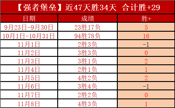 昨天胜利发挥,11月8天仅出现2天负值保持正向胜+,十月月成绩胜+16,月成绩保持强势