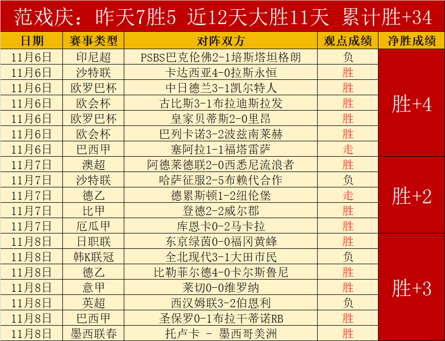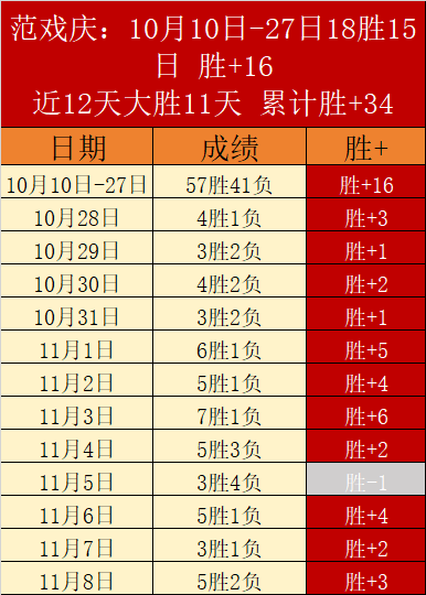 昨天7胜5,近12天大胜11天胜+34,胜+表现尤其突出,胜+表现尤其突出,10月10日-27日18天胜15天胜+16,胜+表现尤其突出