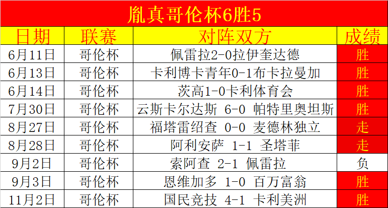 哥伦杯6胜5,发挥出色的美洲赛事。10天胜8天胜+15,傲视群雄的胜+表现!