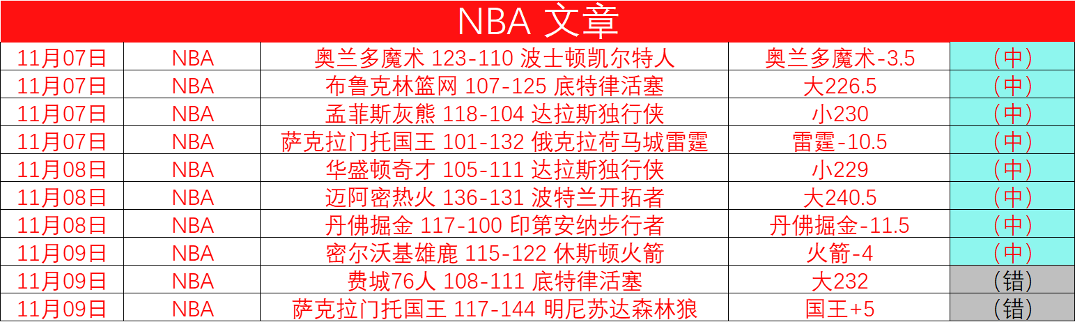 NBA豪华10中8,非常棒。信心高的场次还是比较有把握的,每天也没必要写太多场了,提高正确率,更重要。