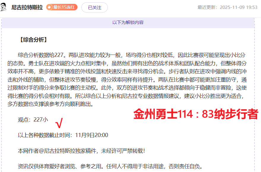 【成绩回顾】昨拿下3战胜,NBA二战胜、韩篮甲拿下胜利,尼古拉资深作者情报解读再有方法,信心强项情报解读连胜赛事再次出发,长期解读惊喜不断,此前作者创下4次双位数胜战绩,掌握着一手赛事资深情报,本期继续分享充满奇妙体育赛事,敬请大家持续关注!!