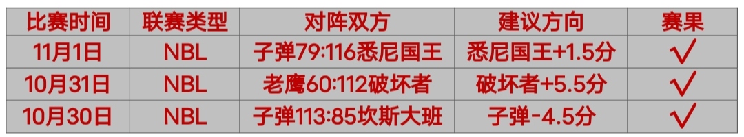 【上轮回顾】此前分享的NBL赛事3场全拿下,本场冲击4连胜,再接再厉,力争拿下。