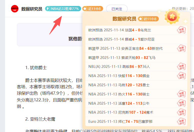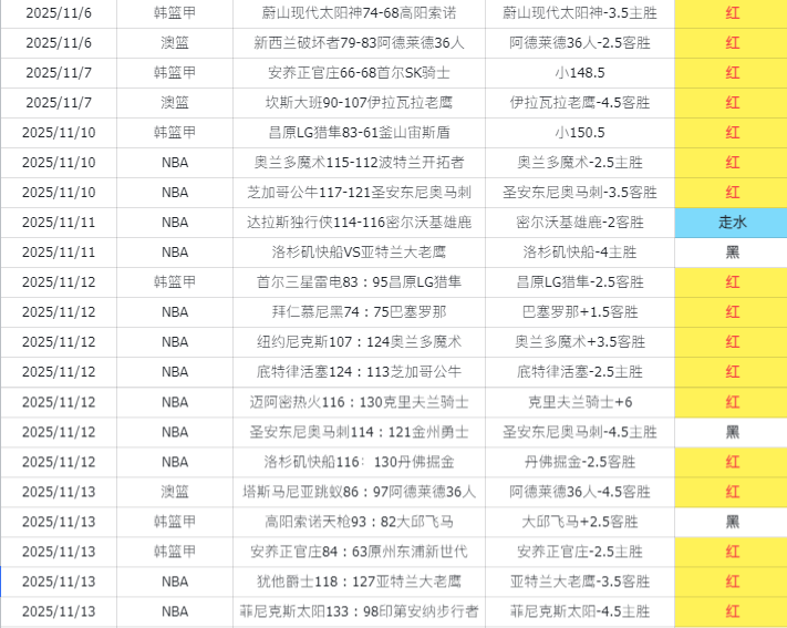 早上的两场NBA继续拿下,昨日篮球5中4,还是非常不错的,咋其中NBA已经来到24中19,命中率非常高,整体篮球17红3黑1走,战绩非常稳!