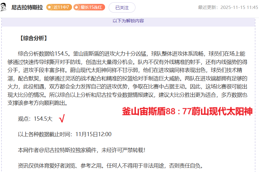 【成绩回顾】近12胜8,昨日韩篮甲、NBL、NBA取得胜利,尼古拉资深作者情报解读再有方法,信心强项情报解读连胜赛事再次出发,长期解读惊喜不断,此前作者创下4次双位数胜战绩,掌握着一手赛事资深情报,本期继续分享充满奇妙体育赛事,敬请大家持续关注!!