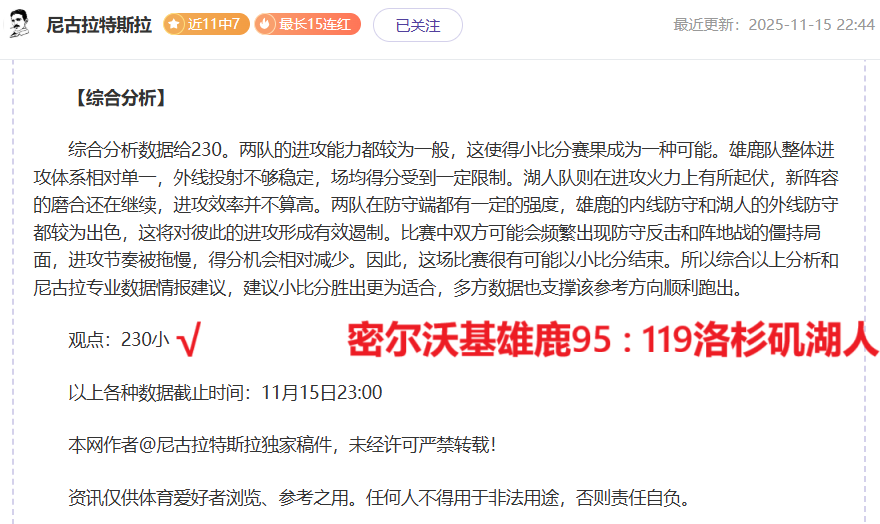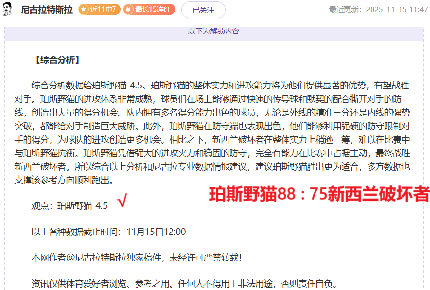 【成绩回顾】近12胜8,昨日韩篮甲、NBL、NBA取得胜利,尼古拉资深作者情报解读再有方法,信心强项情报解读连胜赛事再次出发,长期解读惊喜不断,此前作者创下4次双位数胜战绩,掌握着一手赛事资深情报,本期继续分享充满奇妙体育赛事,敬请大家持续关注!!