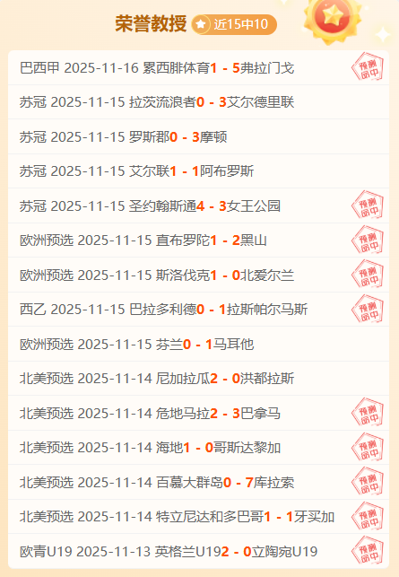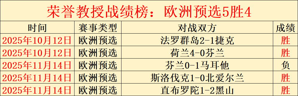 15胜10,欧洲预选5胜4。最高打下14连胜的表现已见证实力。今天继续奉上强项赛事系列,各线赛事都能保证清晰的解读思路与靠谱的选择方向!截至昨天荣誉教授已经有4231场解读经验,今天继续精选5场,多元化的赛事系列,以更高连胜胜利率绩迎接5000场记录来临,关注荣誉教授,成为荣誉教授的好伙伴!