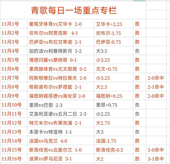 青歌深耕于国内外次级联赛,在某个时间段寻出最值得入手的比赛,长期都保持着不错的收益,昨日10中8(80%)命中四场比分!长线来到了22中16(72%)重点欧预赛有再次拿下!本月重点场次来到了16中12(74.4%),今日请继续关注每天必解的重点场次以及其余信心赛事情报速递!