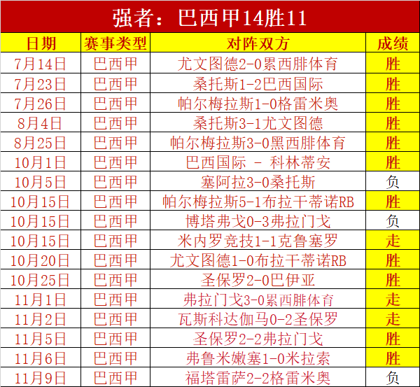 巴西甲14胜11,美洲赛事目前发挥也非常出色,美洲赛事发挥也发挥非常出色。十月月成绩胜+16,双位胜+十分吸引眼球,月成绩保持强势