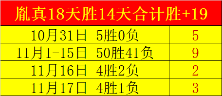 昨天5胜4,连胜2天合计11胜8,18天胜14天胜+19,傲视群雄的胜+表现