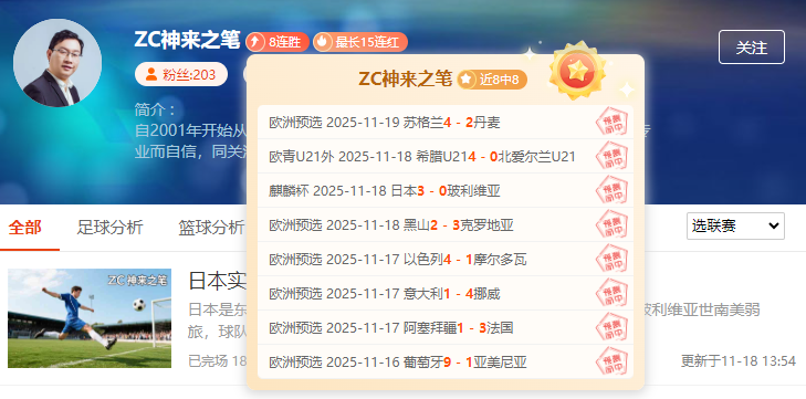 “ZC神来之笔”凭借近8连胜成为平台目前现象作者!近期的欧洲预选赛事稳稳拿捏。他的分析风格注重数据模型的深度结合,欧亚走势的数据拆解,尤其擅长五大联赛主流联赛。关注这位数据流大师,每日收获精选赛事解读!