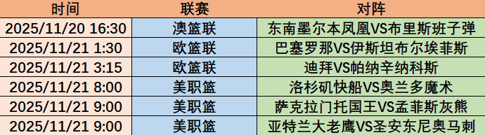 篮球热血赛程来袭! 11月20日至21日,多场焦点战轮番打响!澳篮联东南墨尔本凤凰硬刚布里斯班子弹;欧篮联巴塞罗那、迪拜双强出击;美职篮快船、国王、老鹰齐掀狂潮!巅峰对决,场场刺刀见红!锁定时间,见证篮球激情迸发,错过一秒都可惜!