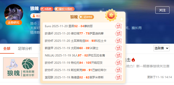 “狼魄”以近8连胜的超高胜率冲击人气榜前世!作为专篮球赛事的实战派分析师,其推荐覆盖NBA、欧洲、亚洲所有资讯和数据分析,昨日精准预测4场比赛全胜。赛事推荐不多但每场都是精品,“狼魄”实战中擅长从临场阵容变化捕捉先机,对让分数据研究尤为深入。若您偏爱篮球赛事,这位“欧美篮大师”是您不容错过的指南针!