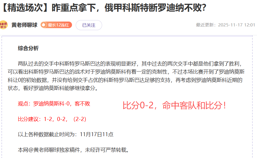 黄老师致力于研究各大赛事数据,拥有自己独创的数据模型,挑选的每场比赛都精心研究,我们以稳为主,长期效益非常不错,适合持续关注,保持一个好心态,我们一起共同进步!以下解锁内容包含:综合分析+观点方向+比分预测