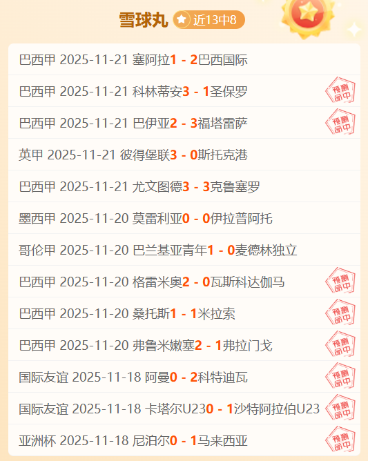 13胜8,今天赛事依旧选择强项系列,持续稳,别错过了!笔者近期前进脚步表现仍然优秀,本日赛程继续出击,争取在稳健的基础上进一步突破!