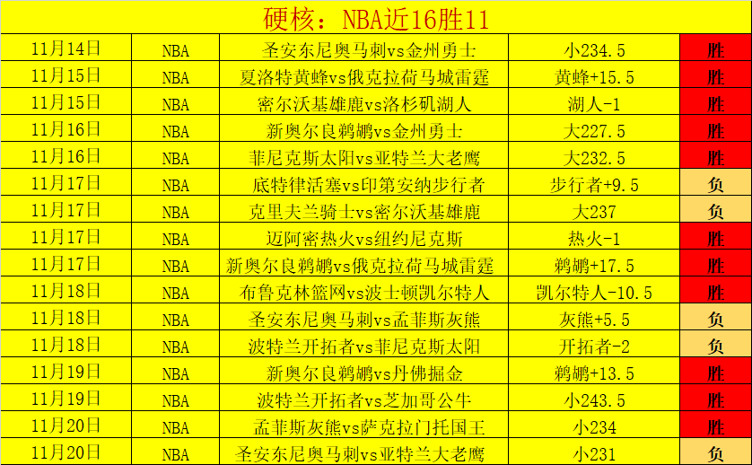 NBA近16胜11,表现非常出色。昨天胜利发挥,近49场胜28场,胜+7,胜+效果非常优质。