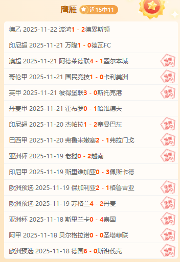 成绩回顾:近期成绩15胜11。感谢一直以来的支持与陪伴,今天看好不错的赛事,强项赛事很有信心,鹰雁也曾创下19连胜的超高记录。愿大家在观赛的同时,也能收获满满的喜悦与惊喜,觉得还行的不妨继续关注,一起开启精彩的足球之旅。