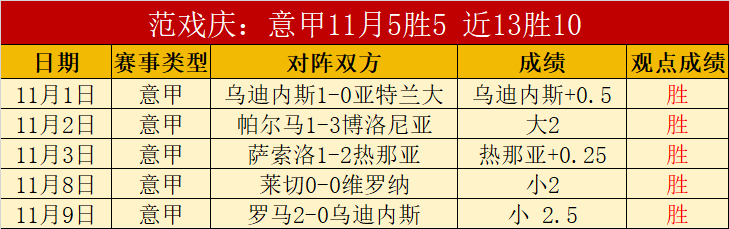 意甲5胜5,近13胜10,精彩的五大联赛开启。近6天保持精彩胜+5,10月10-31日合计胜+23,11月1-15日合计胜+28,这样的胜+表现肯定是独占鳌头的