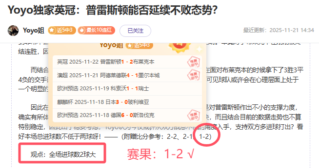 【上期回顾】:昨天公推澳超多进球轻松拿下,而超级重点英冠方案多进球同样击中彩蛋,近期整体状态尚可呀!——今天核心赛事已确认,信心依旧,各位可点击一下【赞赏】按钮给予鼓励,轻松在“站内信”获取当天新鲜信心专场哦!多一份参考离喜悦再近一步,Yoyo将继续率粉粉们继续前行~