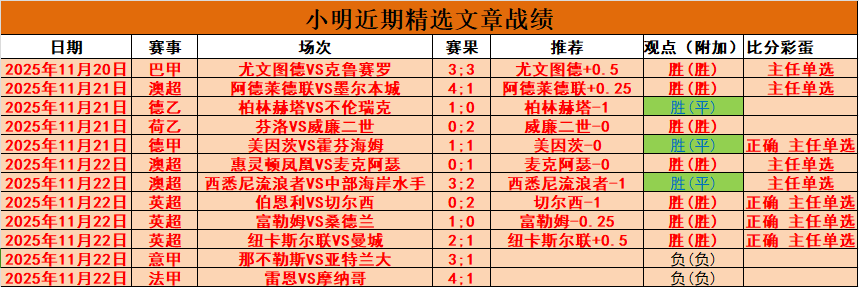 【上期回顾】稳!稳!稳!昨精选7对5,数据4胜1平2负,麦克阿瑟、切尔西、纽卡、富勒姆打出,西悉尼打平。近12仅负2;昨澳超、英超共5场全对,小明非常满意,这5场都是单选题,想必朋友们都拿到大丰收,今继续冲!