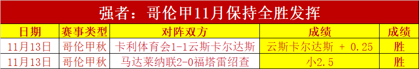 哥伦甲11月保持全胜成绩,非常出色。周末精彩,昨天拿下8胜5,近28场胜18场胜+8。十月月成绩胜+16,双位胜+十分吸引眼球