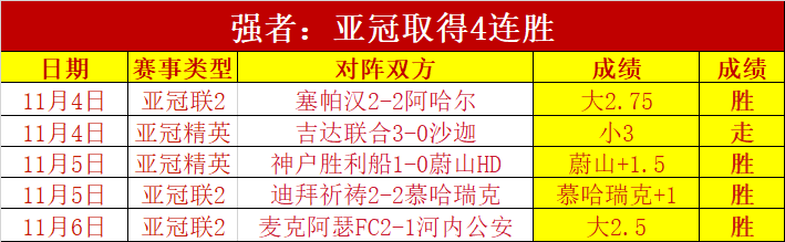亚冠取得4连胜,继续展现出亚系赛事的强大分析实力。昨天7胜5,周末大胜2天合计15胜10,近35场胜23场胜+11。十月月成绩胜+16,双位胜+十分吸引眼球