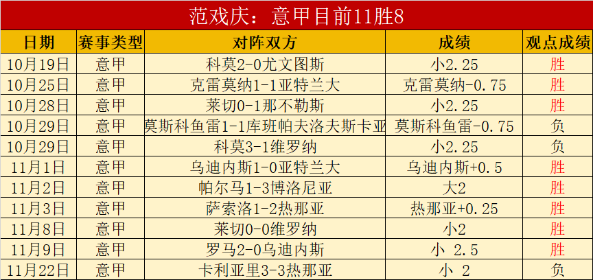 意甲11胜8,五大联赛发挥非常出色。11月1-23日合计胜+27,10月10-31日合计胜+23,这样的胜+表现肯定是独占鳌头的