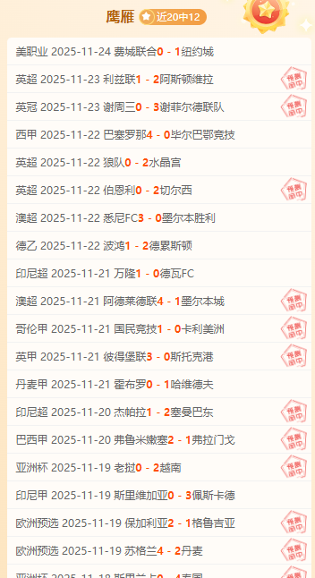成绩回顾:昨日拿下双胜,目前近期成绩20胜12。感谢一直以来的支持与陪伴,今天看好不错的赛事,强项赛事很有信心,鹰雁也曾创下19连胜的超高记录。愿大家在观赛的同时,也能收获满满的喜悦与惊喜,觉得还行的不妨继续关注,一起开启精彩的足球之旅。