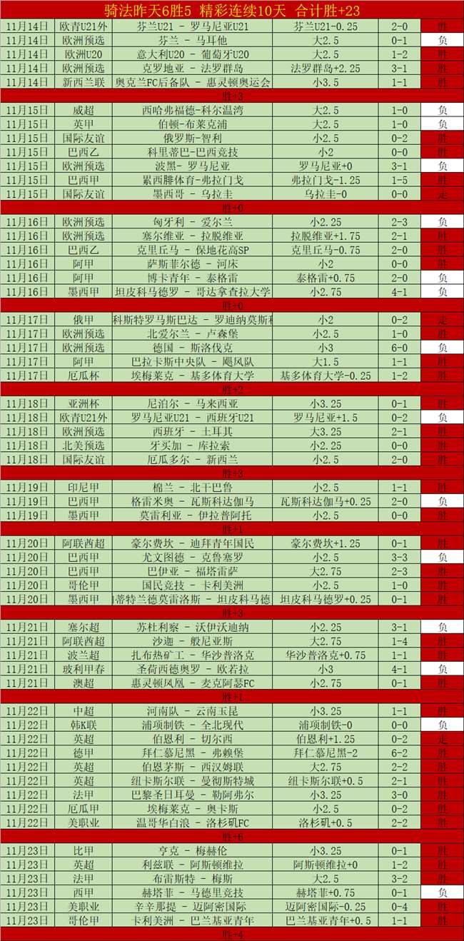 昨天6胜5,连续10天精彩合计胜+23,现在发挥非常出色,在疯狂飙胜+。