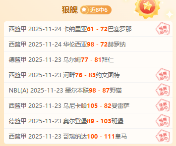 【成绩回顾】近8胜6,昨3场胜利,NBL胜+西篮甲二场胜,深夜赛事连胜势头给力!新一期赛事继续关注赛事延续胜利,作为本网资深作者和篮球分析师实力有目共睹,擅长拆解数据用意,连胜佳绩历历在目,笔者将再接再厉争取得更佳战绩回馈粉丝,本场比赛将精选一场优质情报,敬请关注。