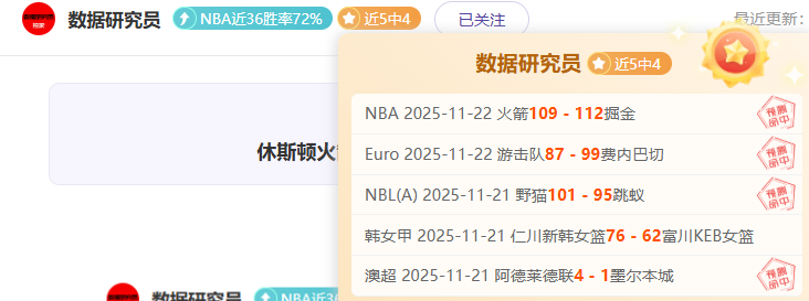 近5中4,NBA近36中26,胜率达到72%,周末因外出有事,内容没有更新,15年足篮实战经验,基于Elo预测法自主建数据研究与分析模型。