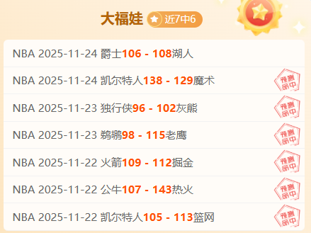 【上期回顾】近7胜6,昨专场NBA再添胜利,本期赛事全力出击赛场解读有关剧本走势!福娃给出的数据分析能够高度精准把握赛事走向并识破有关数据的剧本伎俩,时刻关注数据的变动,本期结合冷热数据解锁胜利走向为大家送上专业的分析,把握好精选场次携手走上胜利的道路。