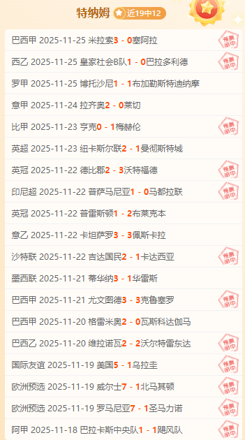 【战绩回顾】昨日取得双胜,近期19胜12。特纳姆将凭借多年深耕足球领域的专业视角,结合独家赛事分析方法,深度解析赛果走向。诚邀各位球迷朋友共同交流探讨,让我们携手冲击高效战绩!