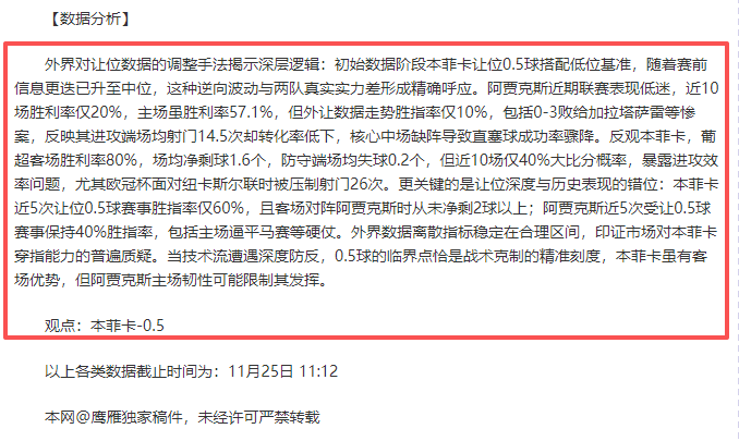 埃因霍温荷甲赛场则展现统治级表现,13轮11胜1平1负积34分高居榜首,攻入41球仅失17球,净剩球达24个,场均净剩1.85球的攻防效率堪称欧洲顶端。客场战绩尤为恐怖,7战全胜且未尝败绩,进22球失7球,胜利率100%,近10场各项赛事8胜2平保持不败,胜利率高达80%,包括5-2大胜福图纳锡塔德、3-2力克费耶诺德等硬仗。然而,欧冠赛场表现却呈现两面性,近5场交锋利物浦虽1胜4负,但唯一胜仗为3-2逆转,且客场作战时危险进攻次数被压制至场均28次,反映跨联赛对抗的适应性短板。外界数据客胜指标从初始8.10高位降至8.00中位,但结合球队近10场仅50%的大比分概率,与当前外让数据升指至球半的手法形成强烈反差。伤停因素或削弱中场控制力,但荷甲场均3.03球的进攻火力能否在安菲尔德延续,成为最大悬念。外界将进球数据调升至3/3.5球,却忽视其近10场仅22.2%的大比分表现,折射出对比赛开放性的误判。