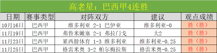 巴西甲昨天拿下胜利,成功取得4连胜,美洲赛事发挥出色。昨天8胜6,近6天胜5天胜+13,11月截至昨天胜+19,9月胜+11,10月胜+19,连续3月双位胜增长