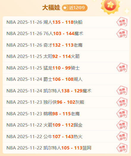 【上期回顾】近12胜9,昨专场NBA再添二连胜,本期赛事全力出击赛场解读有关剧本走势!福娃给出的数据分析能够高度精准把握赛事走向并识破有关数据的剧本伎俩,时刻关注数据的变动,本期结合冷热数据解锁胜利走向为大家送上专业的分析,把握好精选场次携手走上胜利的道路。