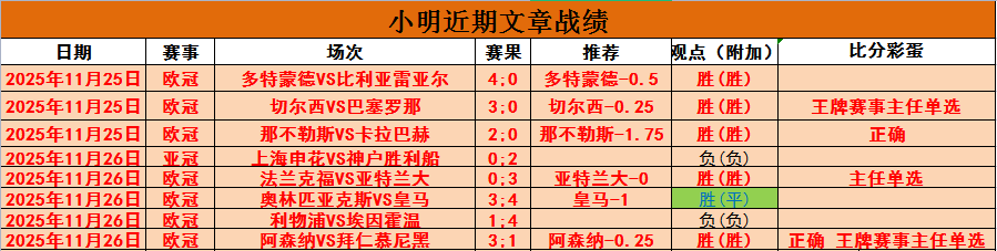 【上期回顾】昨精选5对3,阿森纳、亚特兰大打出,皇马打平。近8仅负2。昨王牌赛事阿森纳继续拿下方向+比分+彩蛋,一鱼三吃,王牌三连胜!欧冠2天8对6表现不错,今欧联继续冲!