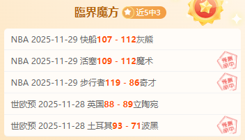 【成绩回顾】昨天3场NBA赛事拿下两场胜利。今日针对世非预以及NBA赛事进行临界值数据深研。